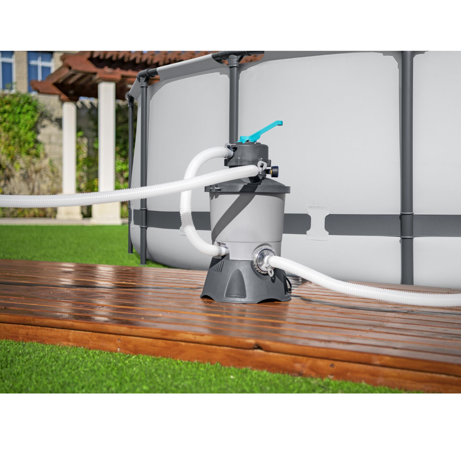 Die Bestway Flowclear Sandfilteranlage mit Pumpe reinigt zuverlässig alle Pools mit einer Kapazität von bis zu 18.100 Litern und garantiert glasklares Wasser für das perfekte Badevergnügen.