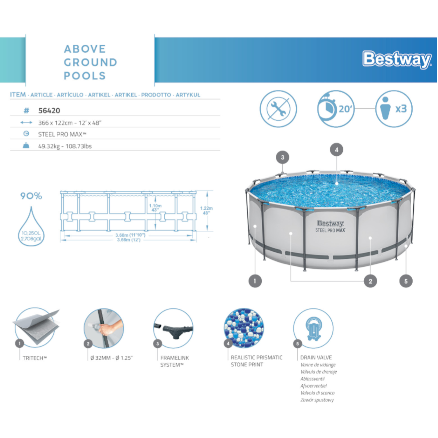 Bestway 56420 Frame Pool Steel Pro Set 366x122 cm Filterpumpe Leiter Zubehör