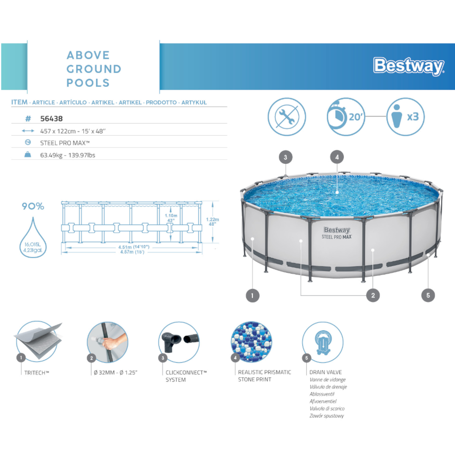 - Maße: Durchmesser 457 cm, Tiefe 122 cm
